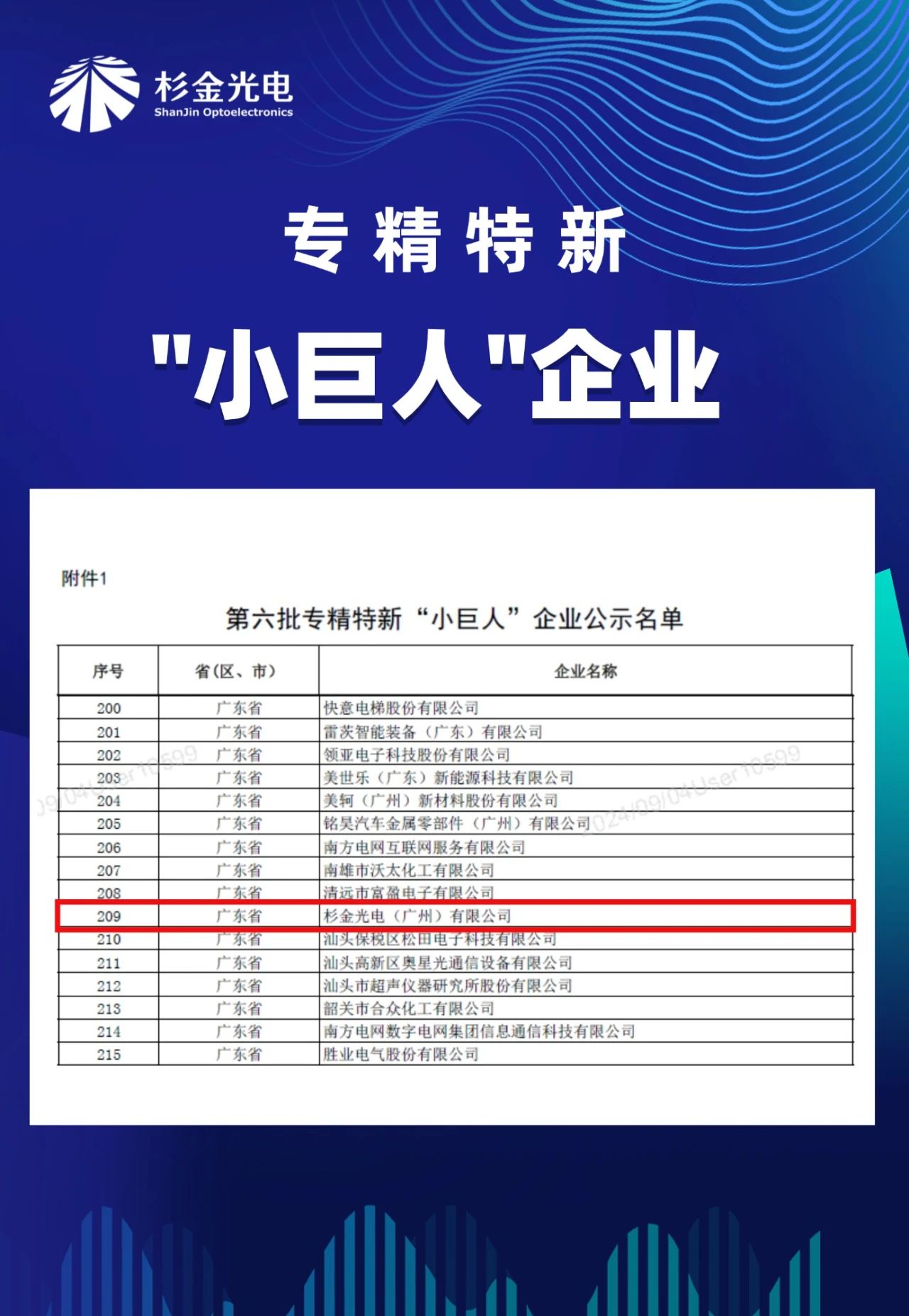 近日,廣東省工業(yè)和信息化廳公示了最新一批專精特新“小巨人”企業(yè)名單,杉金光電廣州公司榮列其中。