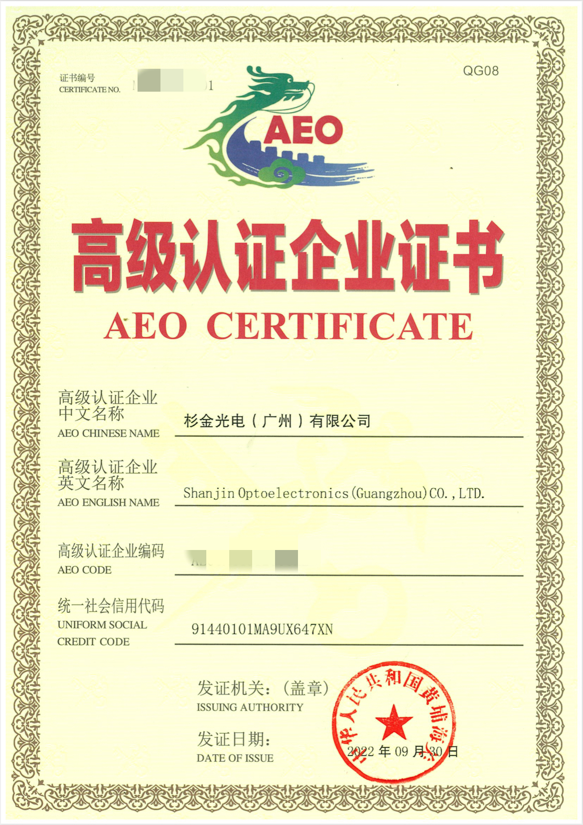 廣州法人自2022年3月起,經(jīng)過黃埔海關(guān)企業(yè)管理處及蘿崗海關(guān)認(rèn)證中心悉心指導(dǎo)與法人全體員工積極籌備,在海關(guān)的敬業(yè)及高效的工作環(huán)境下,使我司自8月4日申請后60日內(nèi)于2022年9月30日獲得黃埔海關(guān)頒發(fā)的AEO(Authorized Economic Operator,經(jīng)認(rèn)證的經(jīng)營者)高級認(rèn)證企業(yè)證書。