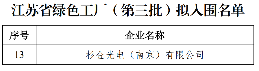 杉金光電(南京)入圍2022年江蘇省綠色工廠